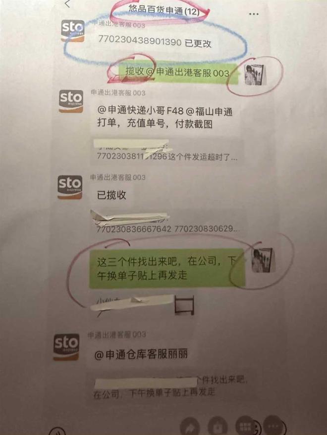 时女士表示,她原本已停止公开讨论,准备等待警方调查,但粉丝随后提供的“关键证据”让她震惊。这是一张群名为“悠品百货申通”的微信群截图,共12人,聊天内容疑似讨论“找出快递、换单再发走”等操作,让她愈发坚信有人协助买家调包。
