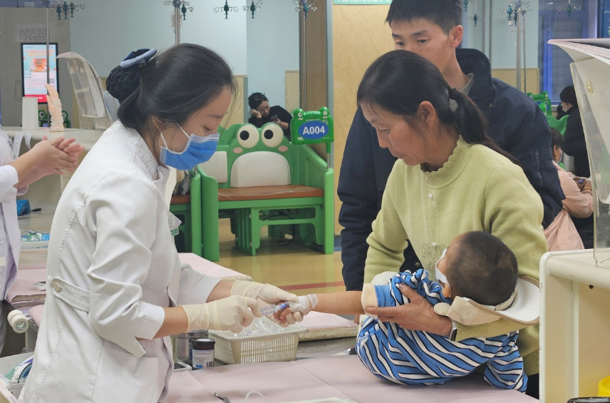 △北京儿童医院输液中心,护士为患儿注射。