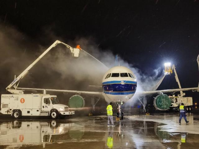 降雪开始后,机场对飞行区道面结冰情况进行定时检测与运行评估,同时对廊桥口等旅客通行重点区域提前实施除冰雪作业,最大限度降低天气影响。