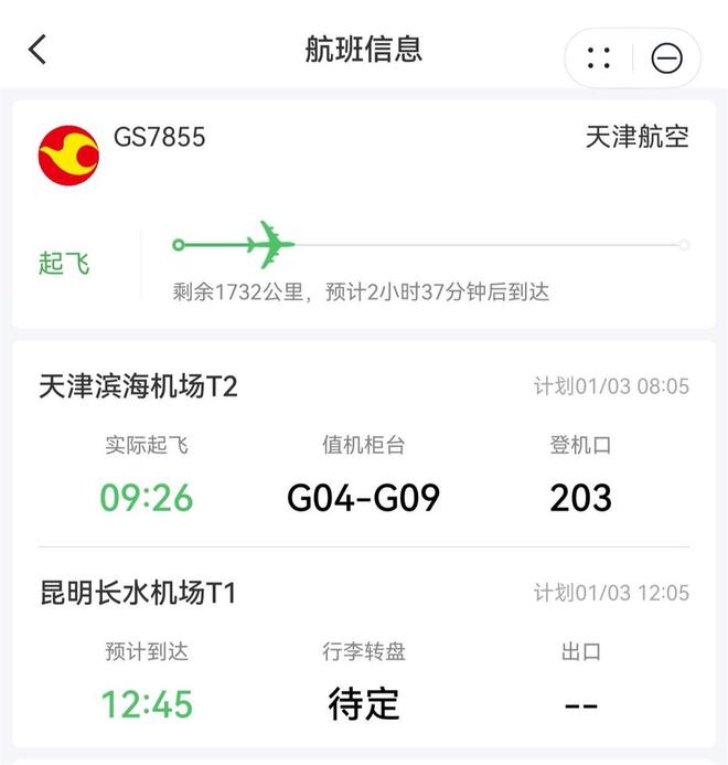 航班原计划3日上午8:05从天津起飞前往昆明,但因准备起飞时出现滑回过程,最终于上午9:26起飞,延误时间超过一小时。天津航空公司客服表示,延误原因记录为“旅客原因”,具体情况正在调查中。