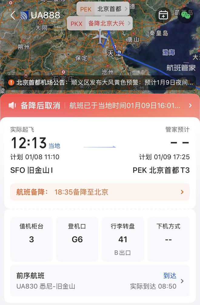 美国联合航空UA888航班因天气备降北京大兴后取消