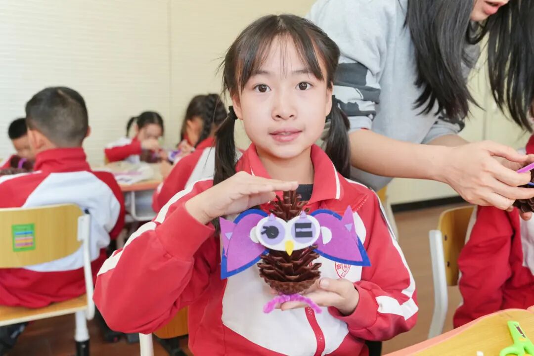 北京校园开展“美林美育”艺术体验课 孩子用松塔创造独特猫头鹰作品