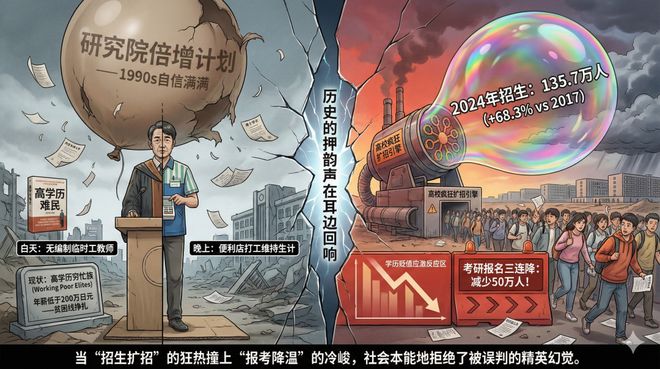 2024年,中国研究生招生人数达到135.7万人,较2017年增长了68.3%²;然而,2025年考研报名人数却出现了“三连降”,减少了50万人³。一边是“高校疯狂扩招”,那一边是“学生用脚投票”。“招生扩招”与“报考降温”这种剧烈的背离,正是社会对“学历贬值”最本能的应激反应。