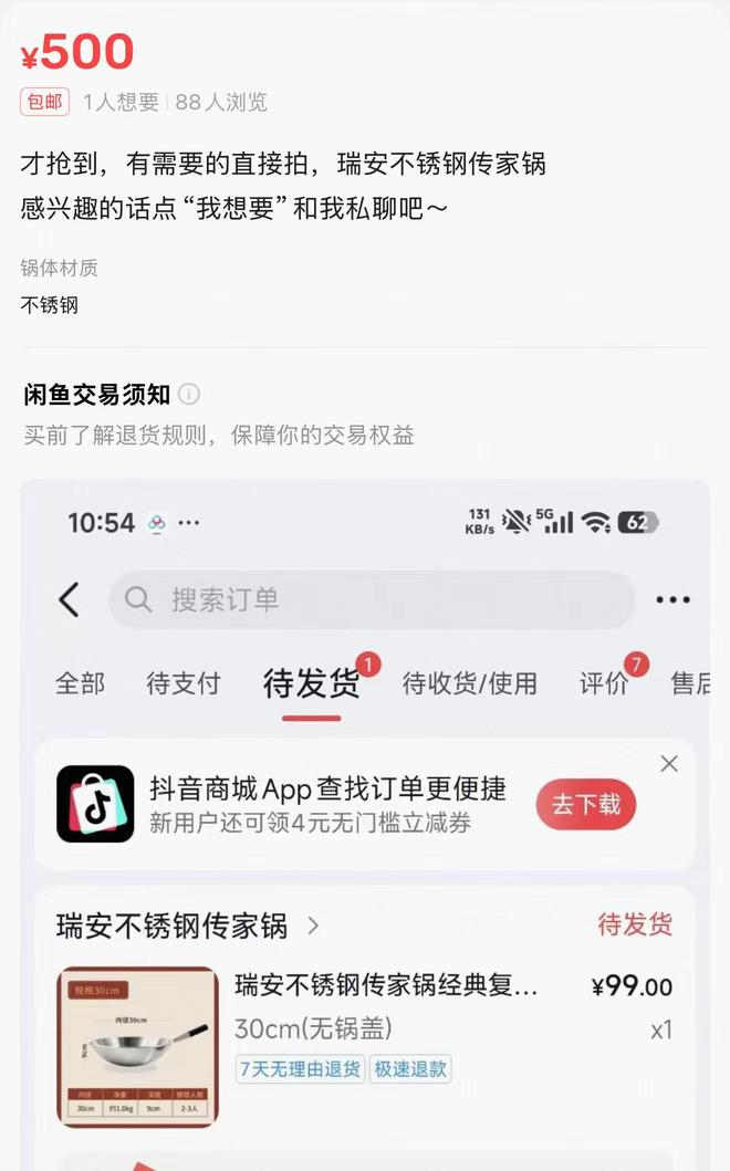 99元锅具有人挂牌500元 图源:时代财经截图自闲鱼平台