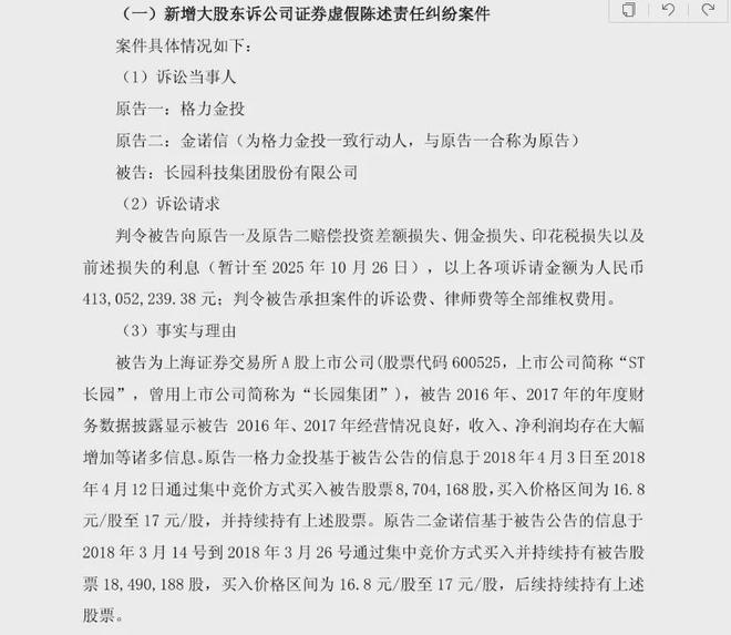 乔文健被留置并非ST长园近期面临的唯一危机。11月13日,公司公告披露,第一大股东珠海格力金融投资管理有限公司及其一致行动人珠海金诺信以证券虚假陈述责任纠纷为由,向ST长园提起诉讼,索赔金额合计约4.13亿元。