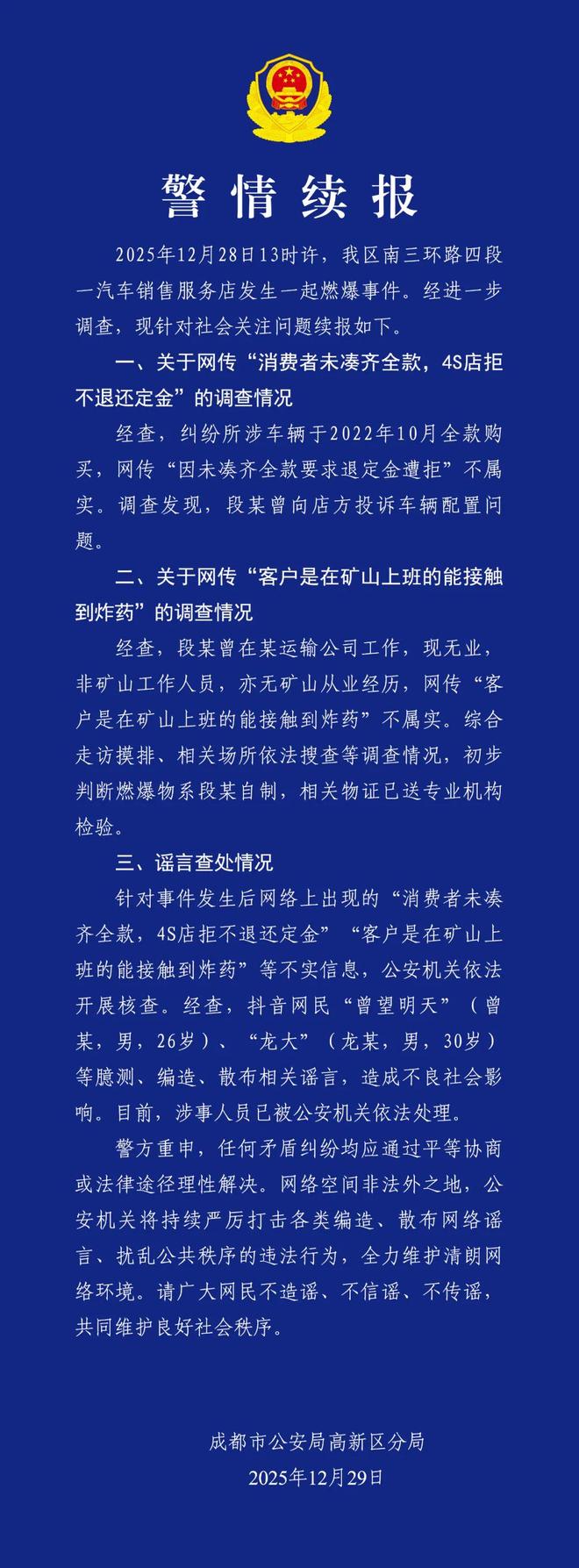 2025年12月28日13时许,成都高新区南三环路四段一汽车销售服务店发生燃爆事件。经进一步调查,警方发布最新情况如下:
