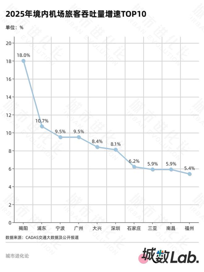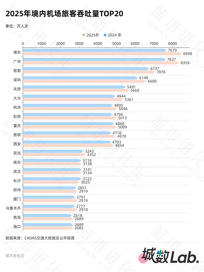 揭阳潮汕机场的“入列”使广东成为全国首个拥有四个千万级机场的省份。2025年,上海浦东、广州白云机场旅客吞吐量先后突破8000万人次,位居全国领先。从全年旅客吞吐量看,白云机场与浦东机场差距仅约100万人次,竞争激烈。