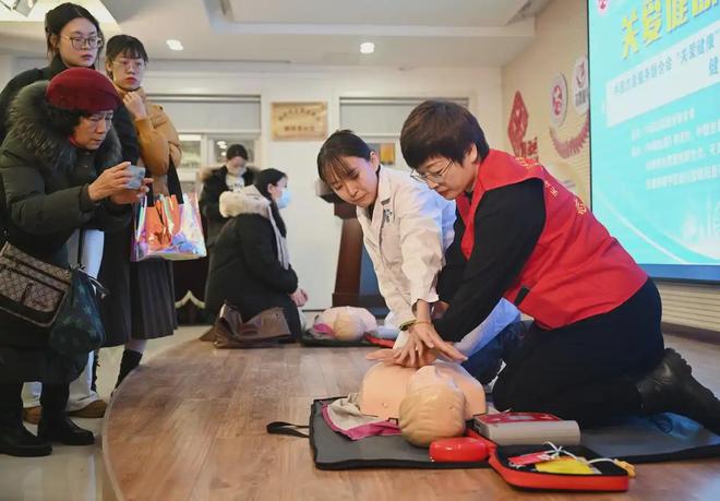 2024年1月17日,在天津市和平区新兴街朝阳里社区,医务人员和志愿者为社区居民讲解心肺复苏知识。新华社记者 赵子硕摄
